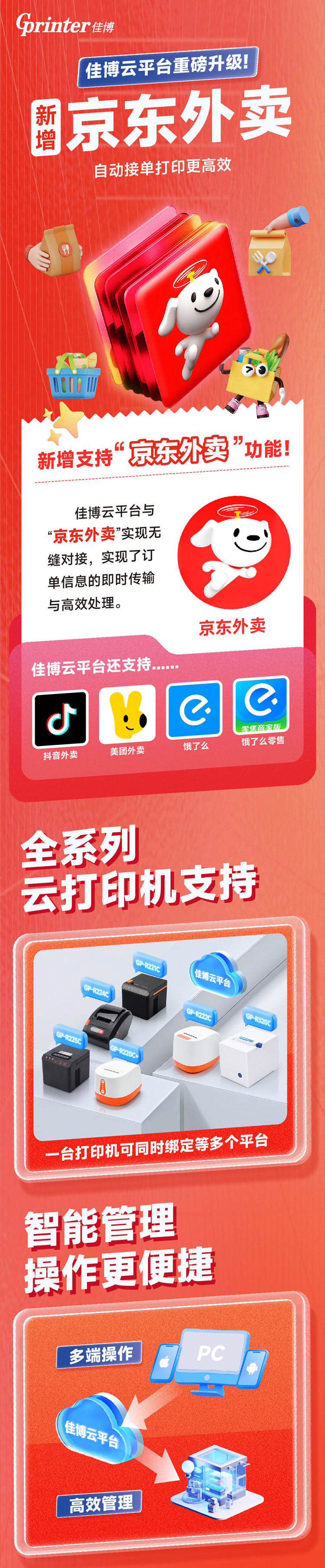 好消息!佳博云平臺(tái)迎來重磅升級(jí)——新增支持“京東外賣”功能!此次升級(jí)標(biāo)志著佳博云打印技術(shù)在外賣配送領(lǐng)域的進(jìn)一步拓展,為餐飲商家提供更高效、更智能的打印解決方案,助力外賣訂單處理效率全面提升。