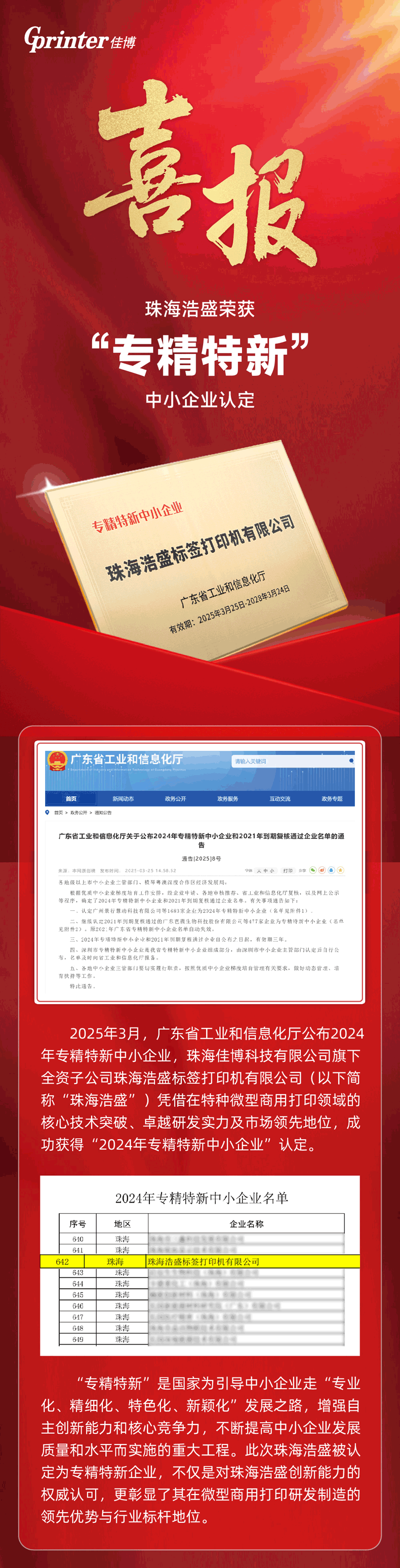 2025年3月,廣東省工業(yè)和信息化廳公布2024年專精特新中小企業(yè),珠海佳博科技有限公司旗下全資子公司珠海浩盛標(biāo)簽打印機(jī)有限公司(以下簡(jiǎn)稱“珠海浩盛”)憑借在特種微型商用打印領(lǐng)域的核心技術(shù)突破、卓越研發(fā)實(shí)力及市場(chǎng)領(lǐng)先地位,成功獲得“2024年專精特新中小企業(yè)”認(rèn)定。
