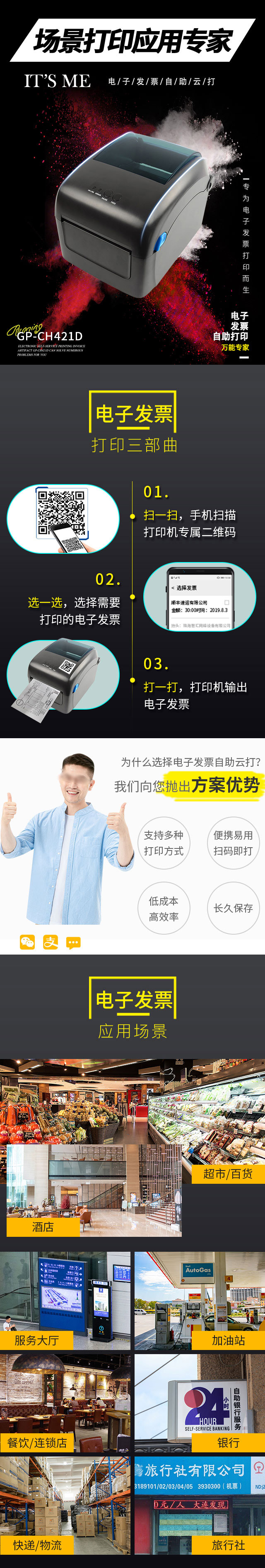 佳博GP-CH421D一款專門為打印電子發(fā)票而設(shè)計(jì)的4寸標(biāo)簽云打印機(jī),這也是當(dāng)下最火的”云技術(shù)“的一種延伸產(chǎn)品,無需繁瑣操作,也不需要額外連接電腦等設(shè)備,只需要接入網(wǎng)絡(luò),用戶就可以用微信或支付寶掃描二維碼,自助打印電子發(fā)票,立打可取,非常便捷。